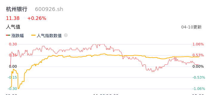 04月10日,杭州银行收报11.38,股价涨幅0.26%,成交金额2.46亿元,换手率0.40%。