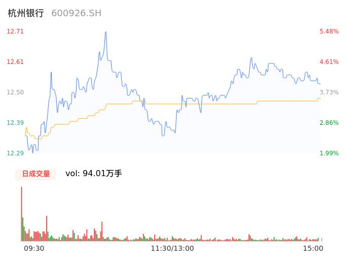 04月22日,杭州银行收报12.54,股价涨幅4.07%,成交金额11.73亿元,换手率1.75%。
