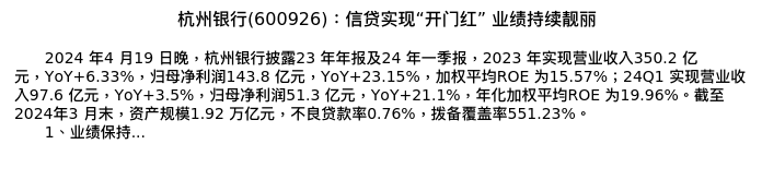 值得注意的是:2024年04月招商证券的戴甜甜分析师,首次发布关于杭州银行的研究报告,标题为:杭州银行(600926):信贷实现“开门红” 业绩持续靓丽。