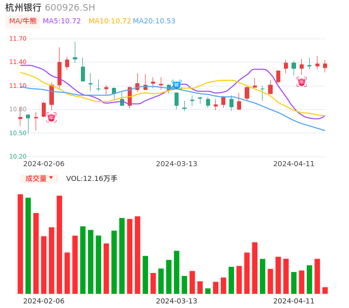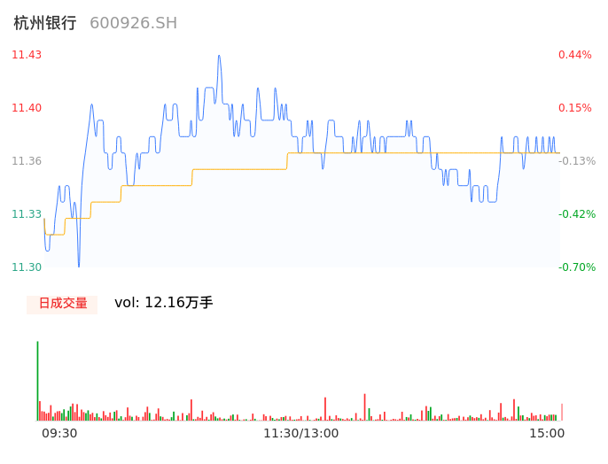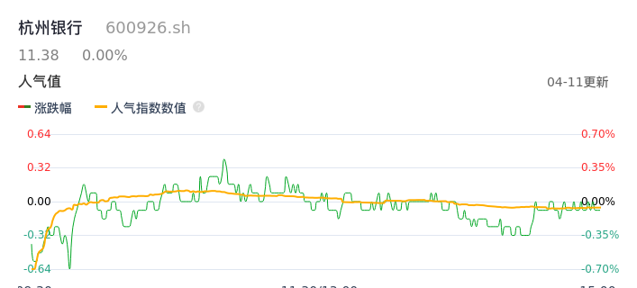 04月11日,杭州银行收报11.38,股价涨幅0.00%,成交金额1.38亿元,换手率0.23%。