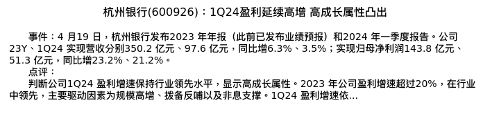 值得注意的是:2024年04月东兴证券的林瑾璐/田馨宇分析师,首次发布关于杭州银行的研究报告,标题为:杭州银行(600926):1Q24盈利延续高增 高成长属性凸出。