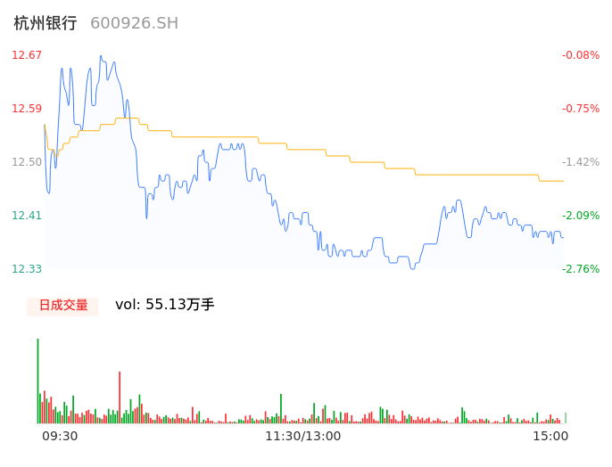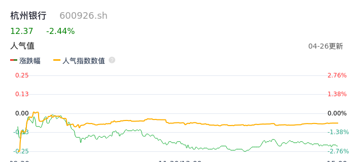 04月26日,杭州银行收报12.37,股价涨幅-2.44%,成交金额6.88亿元,换手率1.03%。