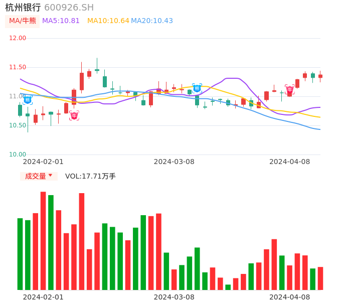 04月08日,杭州银行收报11.37,股价涨幅0.44%,成交金额2.01亿元,换手率0.33%。