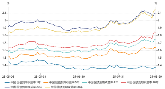 上周,长端利率债收益率上行。截至8月29日收盘,1Y、5Y、7Y国债分别报收1.37%、1.64%、1.74%,分别较前一周收盘变动0BP、1BP、0BP;10Y、20Y、30Y国债分别报收1.84%、2.10%、2.14%,分别较上周收盘变动6BP、0BP、6BP。