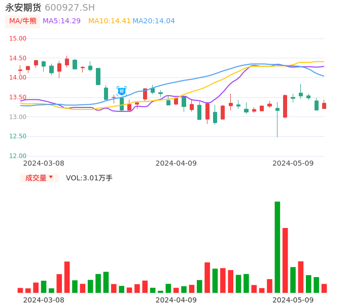 05月09日,永安期货收报13.35,股价涨幅1.37%,成交金额4019.26万元,换手率0.57%。