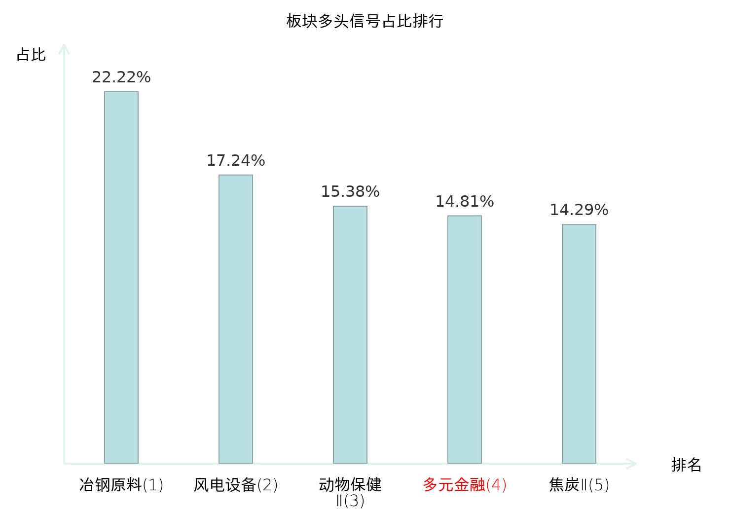 全市场所有行业板块中主力多头信号占比排名中,冶钢原料板块位居第一。冶钢原料板块名次提升最快,较昨日上升118位。