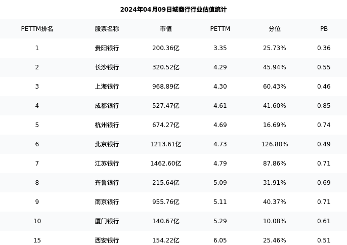从估值角度看:西安银行最新市盈率PETTM为6.05,在行业内排名15/17,处于25.46分位。