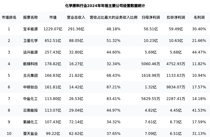 雪天盐业最新报告期数据为年报,下表汇总了化学原料行业内市值靠前的公司年报主要经营数据