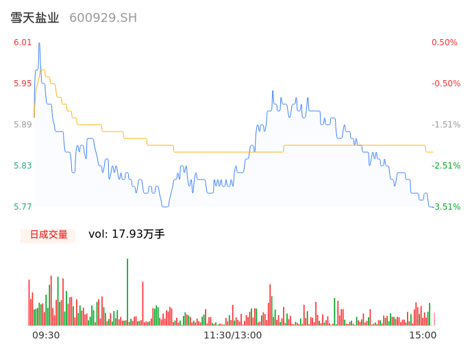 04月16日,雪天盐业收报5.78,股价涨幅-3.34%,成交金额1.05亿元,换手率1.45%。