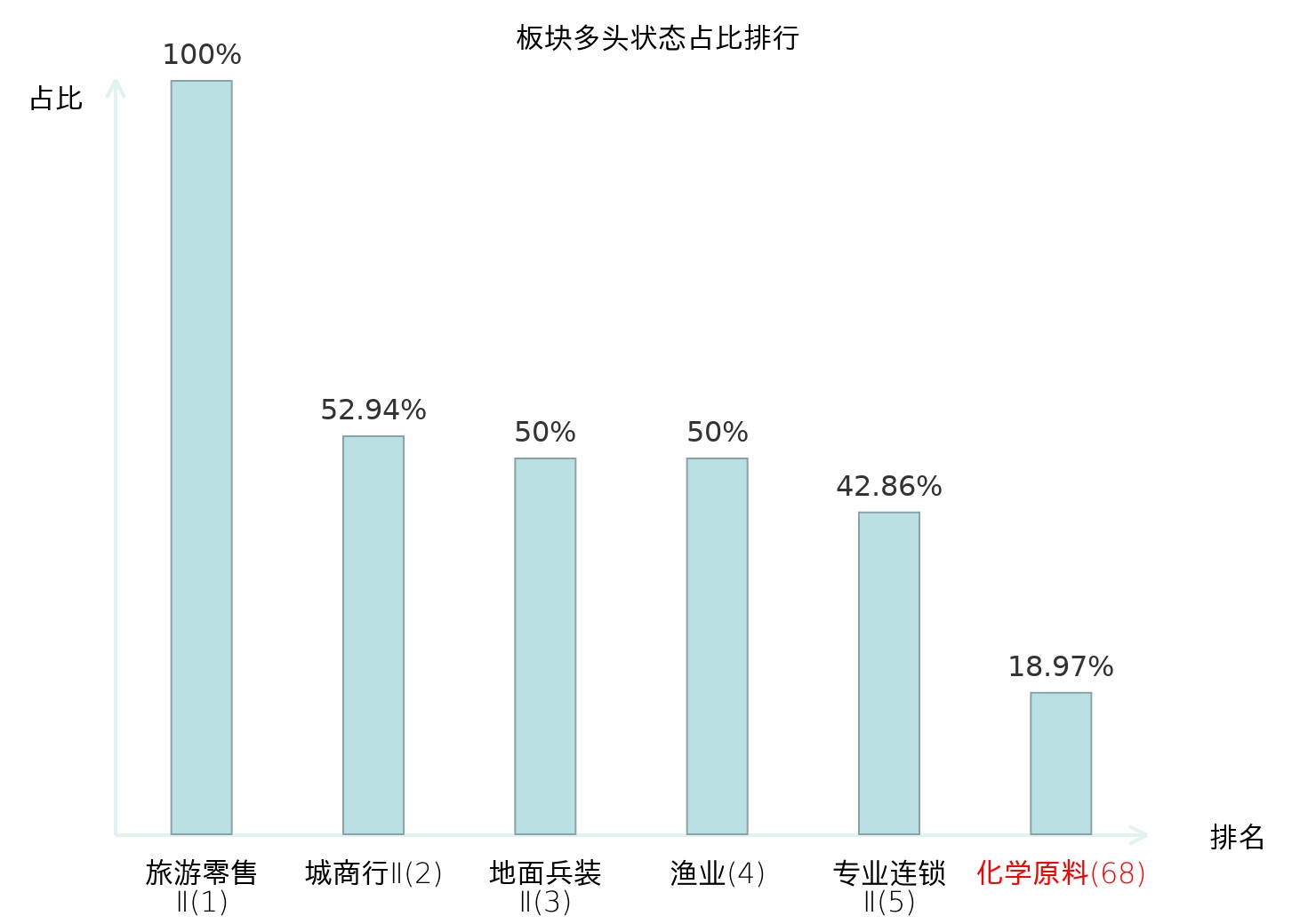 全市场所有行业板块中主力多头状态占比排名中,旅游零售Ⅱ板块位居第一。旅游及景区板块名次提升最快,较昨日上升69位。