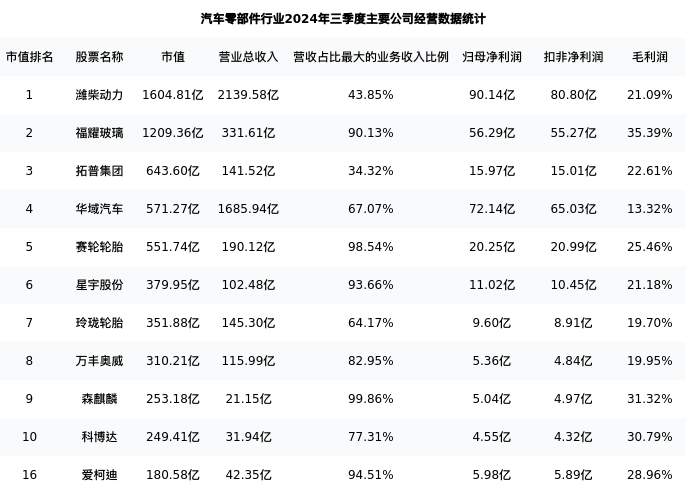 爱柯迪最新报告期数据为三季度,下表汇总了汽车零部件行业内市值靠前的公司三季度主要经营数据