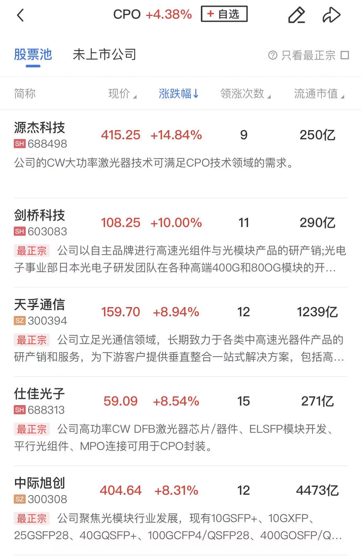 板块上,CPO方向涨幅居前,剑桥科技、景旺电子、汇绿生态涨停,长光华芯、源杰科技、天孚通信、中际旭创等涨幅居前。