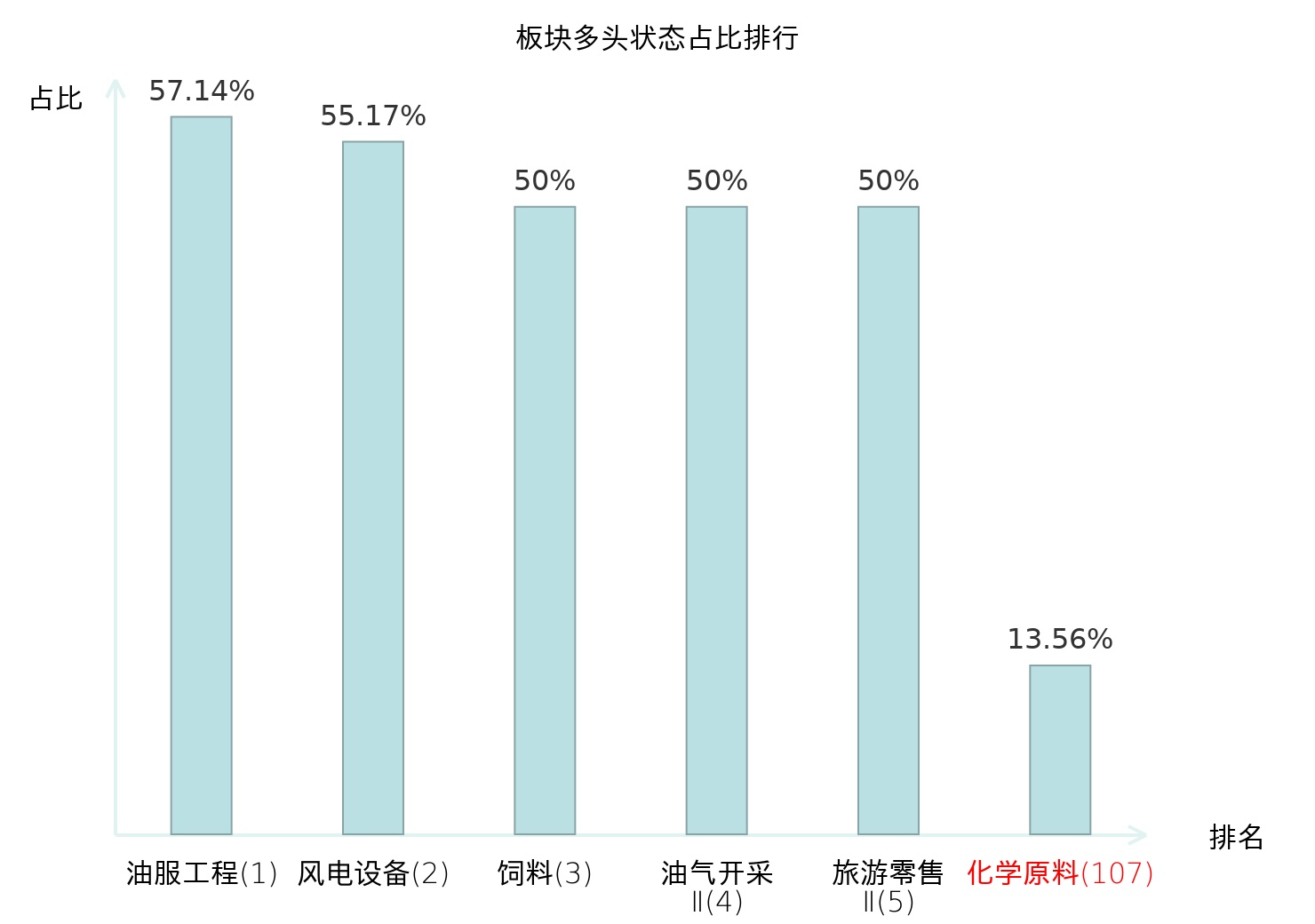 全市场所有行业板块中主力多头状态占比排名中,油服工程板块位居第一。非金属材料Ⅱ板块名次提升最快,较昨日上升67位。