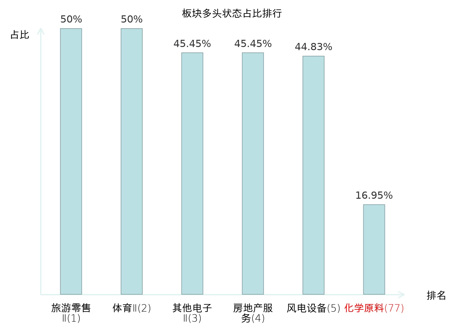 全市场所有行业板块中主力多头状态占比排名中,旅游零售Ⅱ板块位居第一。其他家电Ⅱ板块名次提升最快,较昨日上升112位。