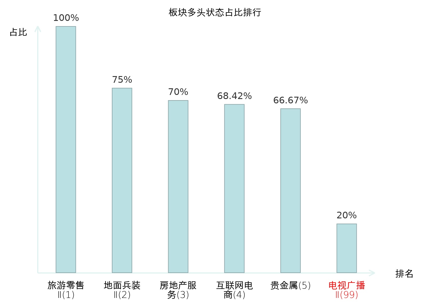 全市场所有行业板块中主力多头状态占比排名中,旅游零售Ⅱ板块位居第一。白色家电板块名次提升最快,较昨日上升65位。
