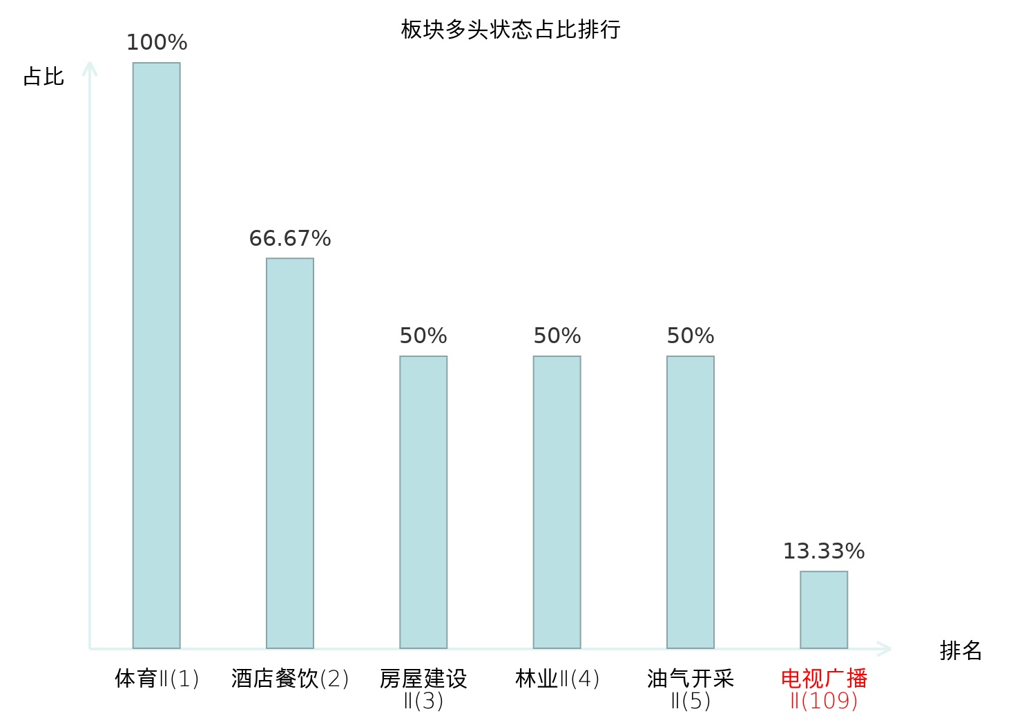 全市场所有行业板块中主力多头状态占比排名中,体育Ⅱ板块位居第一。国有大型银行Ⅱ板块名次提升最快,较昨日上升100位。