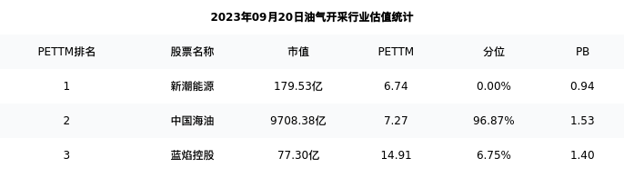 从估值角度看:中国海油最新市盈率PETTM为7.27,在行业内排名2/4,处于96.87分位。