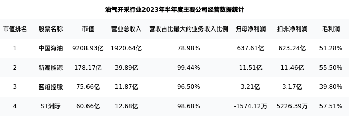 中国海油最新报告期数据为半年度,下表汇总了油气开采行业内市值靠前的公司半年度主要经营数据