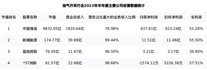 中国海油最新报告期数据为半年度,下表汇总了油气开采行业内市值靠前的公司半年度主要经营数据