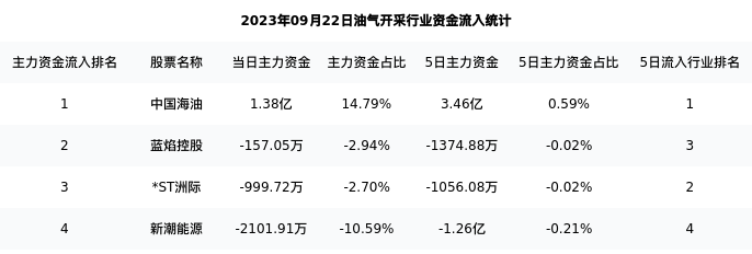 从主力资金流向来看,油气开采行业今日主力资金流入8.18亿元,在所有申万二级行业中排名:9/131。
