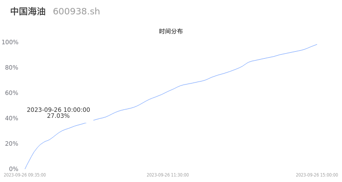 600938中国海油2023年09月26日成交33.75万手,成交金额6.94亿元,相较昨日缩量4.81万手,换手率1.19%,成交清淡。