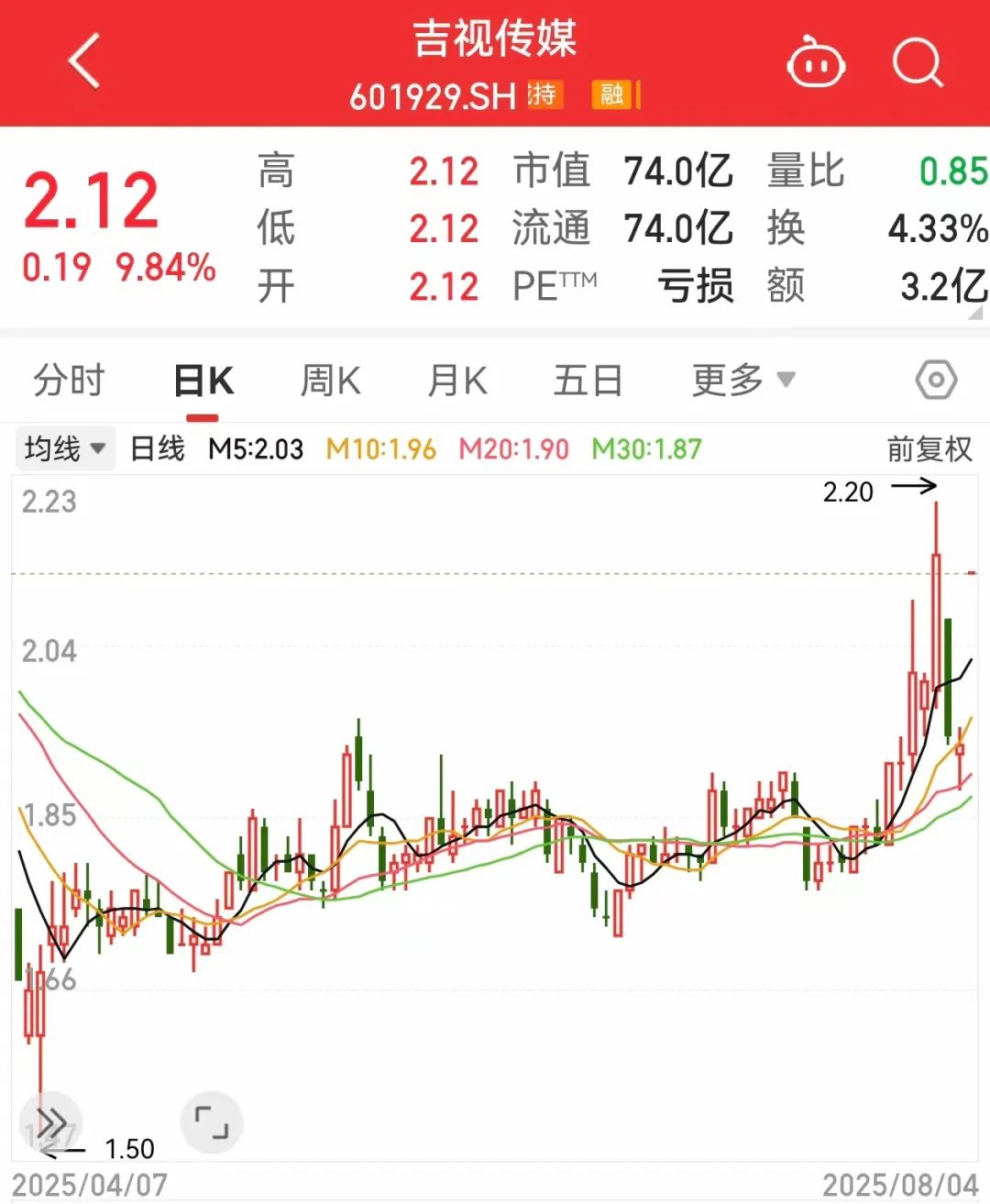 A股影视板块延续近期强势,北京文化、捷成股份、华策影视等早盘高开,资金持续涌入。吉视传媒(601929)一字涨停,早盘成交3.2亿元,换手率4.33%,涨停板上有216.91万手封单。