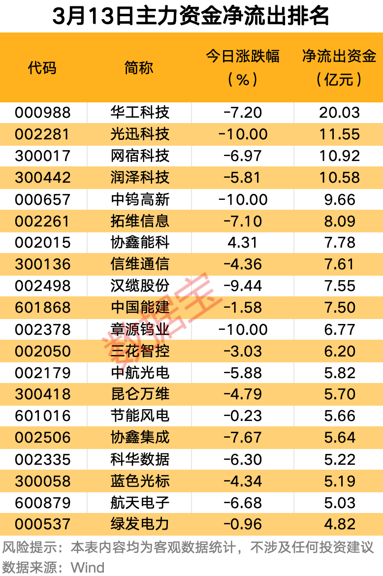 今日有83股主力资金净流出超2亿元,其中,华工科技、光迅科技、网宿科技、润泽科技4股净流出金额居前,均超10亿元。