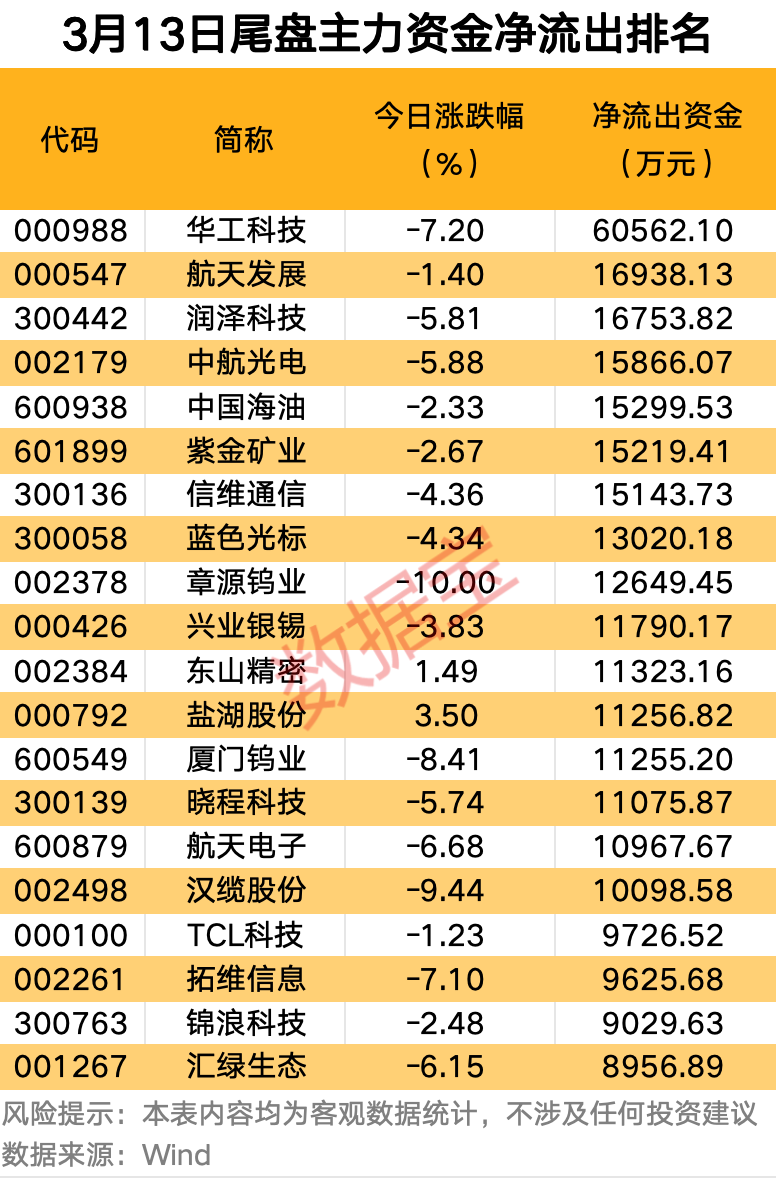 尾盘主力资金净流出方面,华工科技尾盘主力资金净流出超6亿元,航天发展、润泽科技、中航光电、中国海油、紫金矿业等尾盘主力资金净流出均超1亿元。