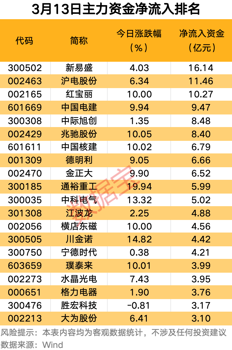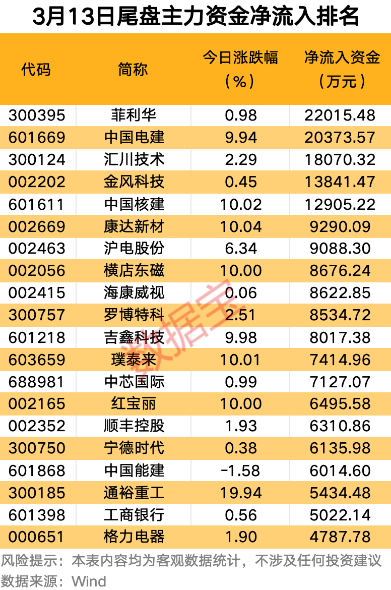 个股方面,菲利华、中国电建尾盘主力资金大幅净流入金额均超2亿元。汇川技术、金风科技、中国核建尾盘主力资金大幅净流入均超1亿元。