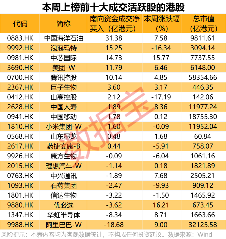 从每日前十大活跃个股来看,本周共有20只个股上榜,阿里巴巴-W本周港股通成交总额最高,达到437.94亿港元,中芯国际、泡泡玛特本周港股通买卖总额均超过200亿港元。