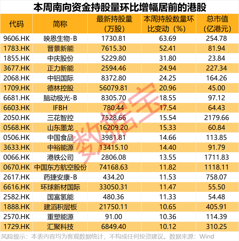 从持股量变化来看,本周20股获得南向资金持股量环比增长超10%,映恩生物-B居首,环比增长63.69%,晋景新能、中庆股份持股量环比增长30%以上。