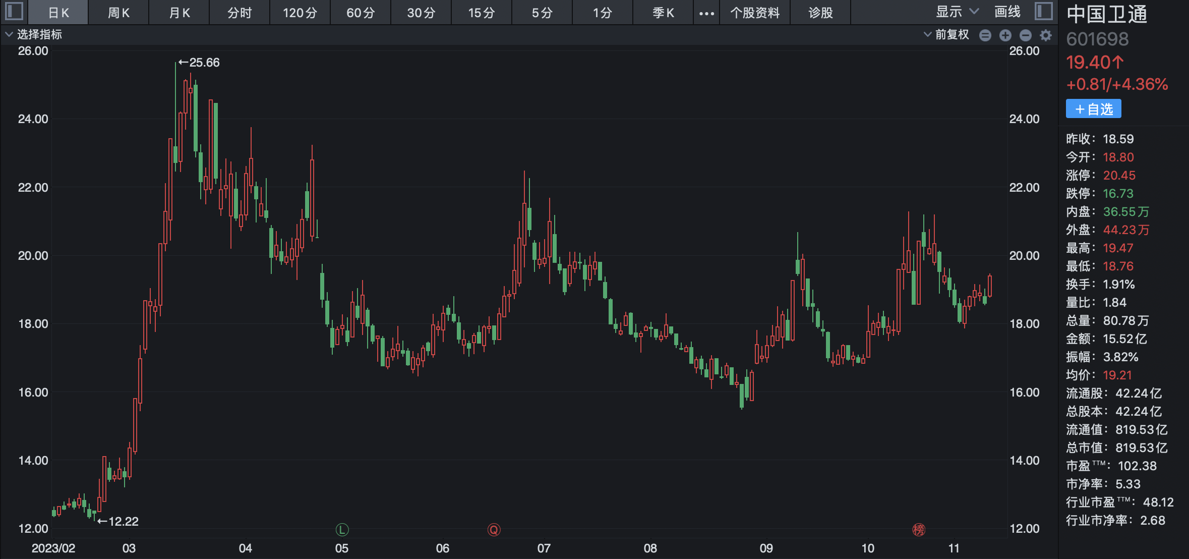 相较于上述个股的“戏剧化”演绎,曾在3月利好密集催化下强势领涨的两大卫星互联网龙头中国卫通和中国卫星在本轮行情中却表现得较为“冷静”,股价均未能重返3月创下的阶段高点,迄今累计最大回调幅度分别约为40%和30%。