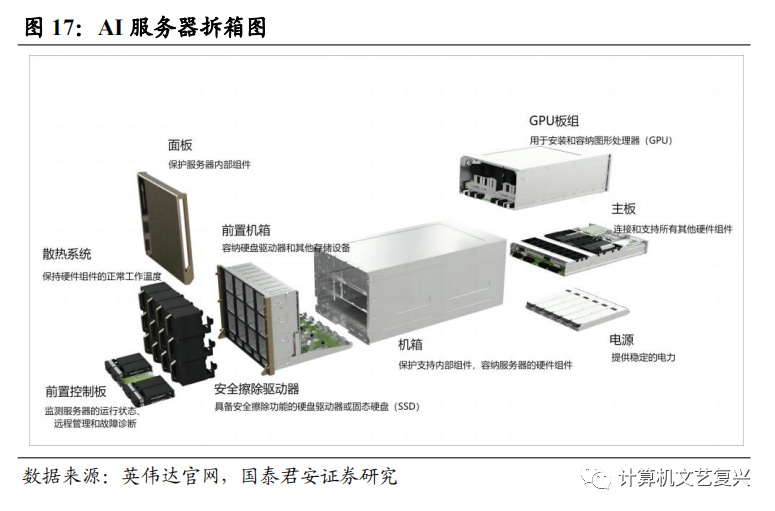 AI服务器中的主要元器件包括CPU、GPU板组、内存、存储、网络接口卡、机箱、主板、散热系统和电源。CPU负责执行计算任务和处理数据,是服务器的主要计算引擎,可以进行复杂的算法和模型运算。加速卡(如GPU、TPU)提供高性能的并行计算能力,用于加速机器学习和深度学习任务,可以加快模型训练和推理的速度。内存(RAM)用于临时存储数据和程序代码,提供快速的数据访问和处理能力。AI服务器通常配备大容量的内存,以支持大规模的数据集和模型。存储设备用于持久化存储数据和模型,包括硬盘驱动器(HDD)、固态硬盘(SSD)和存储阵列(RAID)等,提供高速的数据读写能力和大容量的存储空间。网络接口卡(NIC)提供高速稳定的网络连接,以便与其他服务器、客户端和外部数据源进行数据传输。机箱是AI服务器的外部框架,提供支撑和保护内部组件的结构。背板提供连接各个部件的接口,而布线则用于传输电力和数据信号。主板是AI服务器的核心电路板,连接各个部件并提供电源和数据传输的接口,承载着CPU、内存插槽、扩展插槽和其他重要组件。散热系统用于控制服务器的温度并保持其在安全范围内运行。散热片吸收和分散热量,而风扇则提供气流来冷却服务器内部。电源提供服务器所需的电能,确保各个组件正常运行。