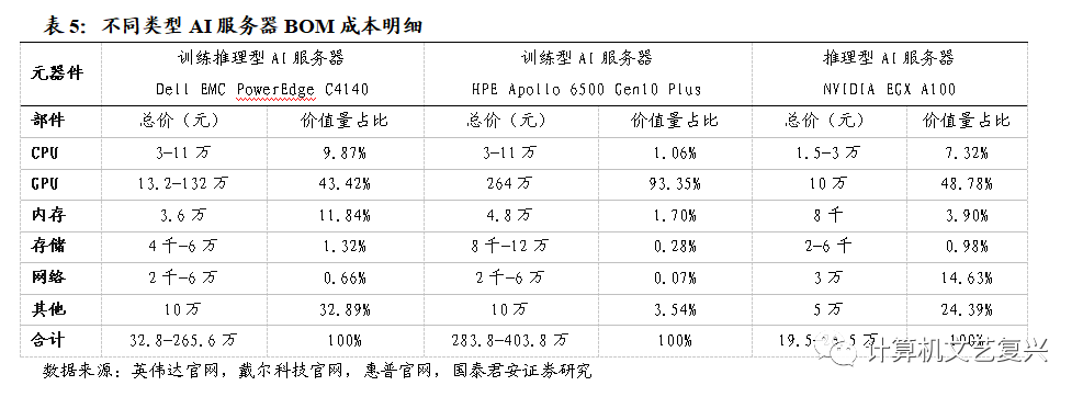 在训练型AI服务器中,通常CPU价值量占比9.8%,GPU占比72.8%,内存占比8.7%,其他占比8.7%。推理型AI服务器中,CPU价值量占比10%,GPU占比50%,内存占比10%,存储占比5%,其他占比25%。以英伟达训练、推理和分析通用的高性能 AI 系统Nvidia DGX H100 为例进行成本拆分,GPU价值量占比则更高,占比86.66%。而CPU价值量则占比2.31%,内存占比3.49%,存储占比1.54%,网络接口卡占比4.85%,其他占比1.15%。