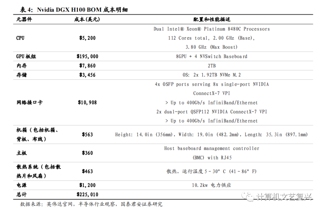 AI服务器的组装和集成价值量取决于多个因素,包括服务器的型号、规模和配置等。组装集成价值量可以根据组装过程中所需的时间、人力成本以及技术要求来衡量。通常情况下,组装集成价值量相对于整个服务器的总成本而言较小,通常在几个百分比以内,具体数值可能会因不同的服务器和供应商而有所差异。对于高端的AI服务器,组装集成成本相对较高,因为它们通常具有复杂的硬件配置和特殊的要求。以英伟达的Nvidia DGX H100为例,服务器的组装成本为1,485美元,占整个服务器的0.553%。在整个AI服务器的总成本中,组装集成过程所占的比例相对较小。组装集成过程对于确保服务器的正常运行和性能发挥非常重要。精确的组装集成可以确保各个元件正确安装、连接和配置,从而保证服务器的稳定性和可靠性。虽然组装集成价值量相对较小,但它对服务器的整体性能和可用性具有重要影响。