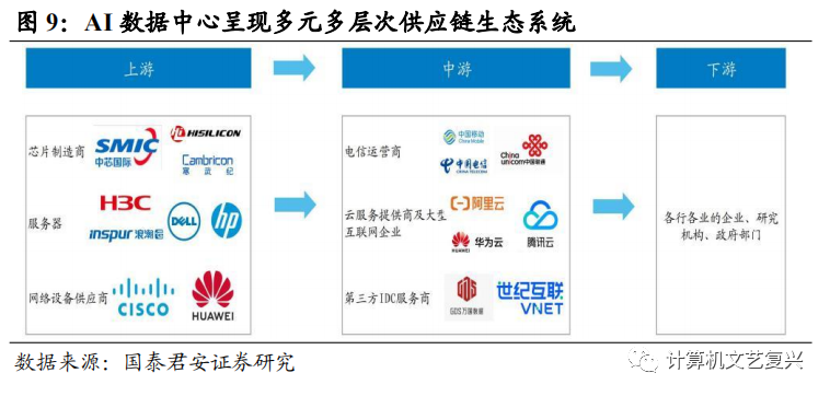 AI数据中心的下游用户需求主要来自各行各业的企业、研究机构和政府部门。这些用户根据自身需求选择合适的云服务提供商或搭建私有数据中心,以满足其对AI技术的需求。下游用户需求的多样性使得AI数据中心市场分散。