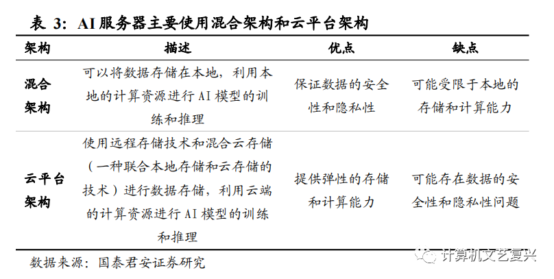 AI服务器是AI数据中心重要的组成部分。AI服务器是专门为人工智能应用而设计和配置的服务器,具备强大的计算能力和高效的数据处理能力,是执行AI任务和处理大规模数据的关键组件,为数据中心提供计算资源和算力,用于执行复杂的AI算法和模型。AI服务器有两种主要架构:混合架构和基于云平台的架构。混合架构允许数据存储在本地,而基于云平台的架构利用远程存储技术和混合云存储来进行数据存储,即联合使用本地存储和云存储技术。AI服务器通常采用异构架构,结合不同类型的处理器,例如CPU和加速卡(如GPU、TPU等),以提供更高的计算性能。这种异构架构使得服务器能够同时处理并行计算和特定的AI计算任务,加速数据处理和模型训练过程。作为数据中心的核心设备,AI服务器承载着计算、存储和网络功能,为数据中心的运行提供稳定的支持,以满足模型训练、推理和数据处理等任务的需求。其可扩展性使其能够适应不断增长的计算和存储需求,保持数据中心的性能和效率。
