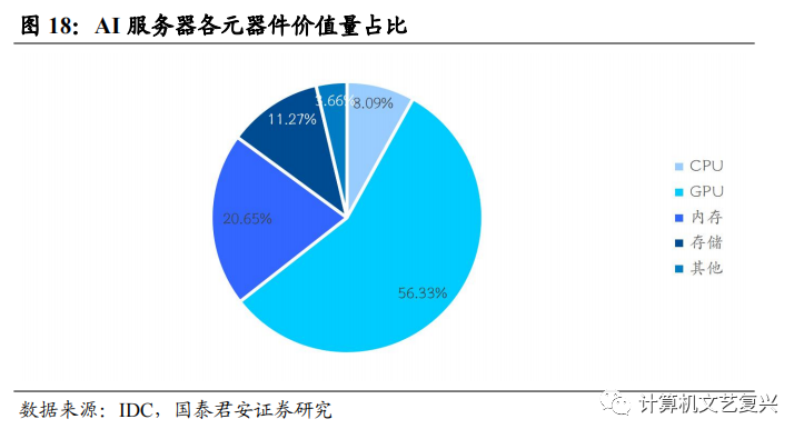 GPU是AI服务器中价值量最高的部件,承担了大部分的计算任务和深度学习模型的训练与推理。在整个AI服务器的投入比例中,GPU通常占据较大的比例,大约在整体投入的30%至60%之间。GPU提供了强大的并行计算能力和高效的深度学习加速,是实现高性能AI计算的关键。其他部件如CPU、存储、网络设备、冷却系统和电源等在整体投入中的比例相对较小,但它们同样是确保服务器正常运行和数据中心高效运作的必要组成部分。CPU作为服务器的核心计算单元发挥着重要作用,而存储、网络设备、冷却系统和电源等则在支持和维护服务器功能上起到关键作用。整个AI硬件产业链中的各个环节紧密合作,共同构建了支持AI应用和服务的完整生态系统。