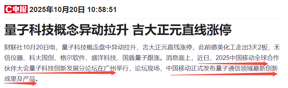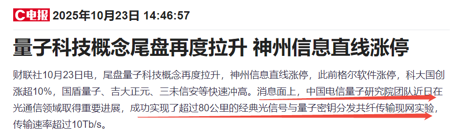 下午量子科技拉升,消息面上又有了新的刺激。中国电信量子研究团队在光通信领域取得进展,实现了光信号和量子密钥分发传输。结合此前中国移动发布的量子通信领域最新成果产品的利好,量子科技这个大多数人还搞不懂的概念,一下就成为了资金的抢点。由于是拉尾盘,因此明天竞价阶段的个股表现很关键,决定了是否还有持续的预期。