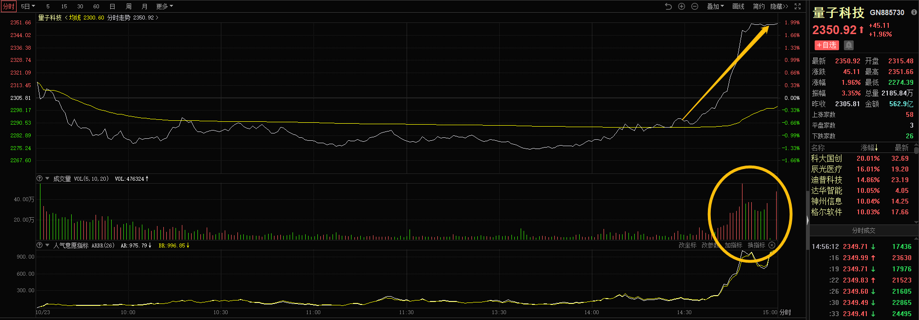 尾盘指数探底回升翻红的时候,量子科技板块突发集体异动,成为了尾盘最热门的方向,大批量的资金涌入。板块指数直接由绿翻红上涨近2%。多股涨停上板。科大国创20%,达华智能、神州信息直线拉板。迪普科技、辰光医疗大涨超10%+。
