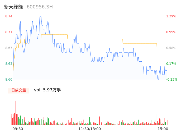 04月30日,新天绿能收报8.62,股价涨幅0.00%,成交金额5178.08万元,换手率0.28%。