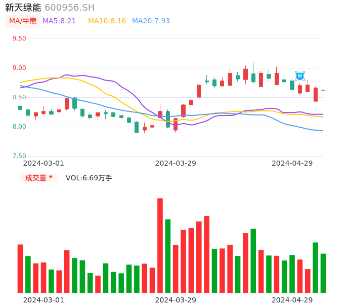 04月29日,新天绿能收报8.62,股价涨幅-0.46%,成交金额5769.98万元,换手率0.31%。
