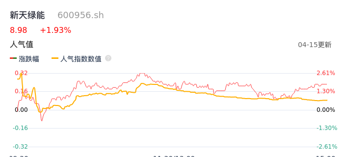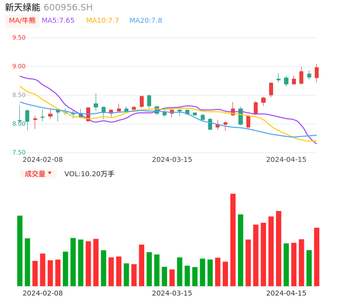 04月15日,新天绿能收报8.98,股价涨幅1.93%,成交金额9110.51万元,换手率0.47%。