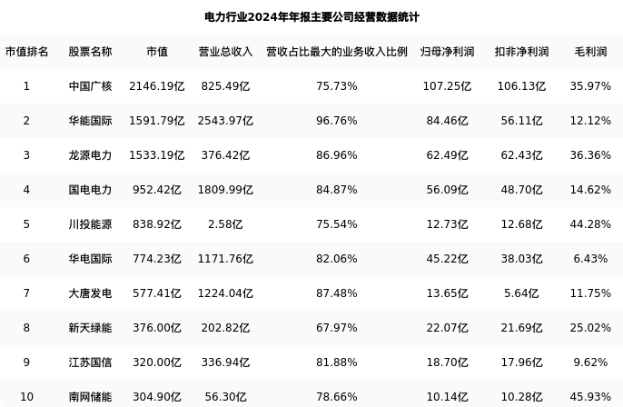 新天绿能最新报告期数据为年报,下表汇总了电力行业内市值靠前的公司年报主要经营数据