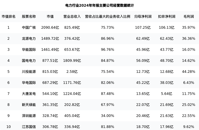 新天绿能最新报告期数据为年报,下表汇总了电力行业内市值靠前的公司年报主要经营数据