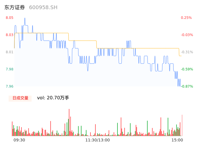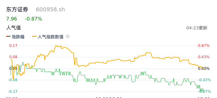 04月23日,东方证券收报7.96,股价涨幅-0.87%,成交金额1.66亿元,换手率0.28%。