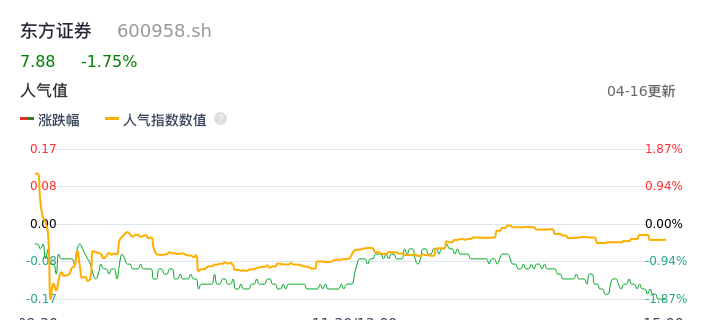 04月16日,东方证券收报7.88,股价涨幅-1.75%,成交金额3.18亿元,换手率0.54%。