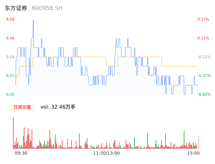 04月11日,东方证券收报8.02,股价涨幅-0.37%,成交金额2.61亿元,换手率0.44%。