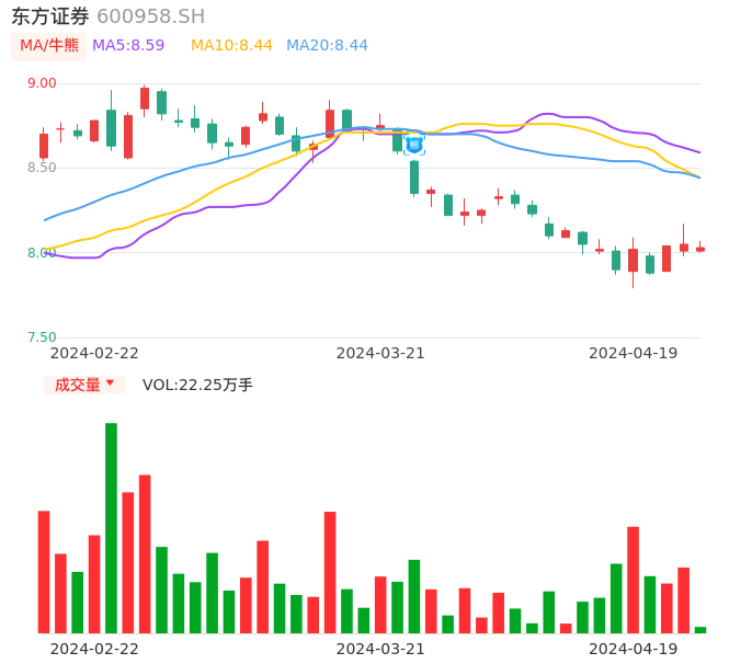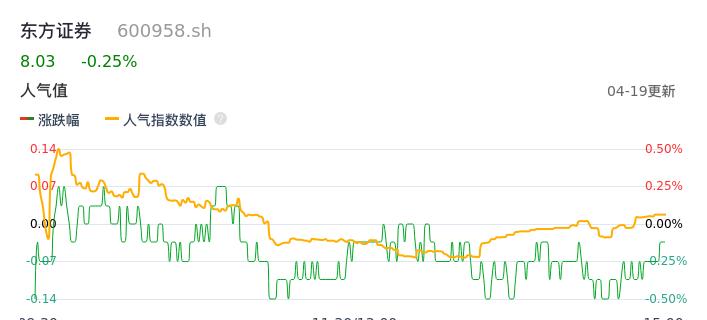 04月19日,东方证券收报8.03,股价涨幅-0.25%,成交金额1.79亿元,换手率0.30%。