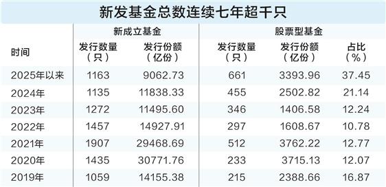 截至2025年10月19日,今年以来新成立基金总数达1163只,已超越2024年全年的1135只。尽管2025年尚未结束,但新成立基金数量已实现超越,显示出基金市场的强劲复苏态势。其中,股票型基金呈现爆发式增长,新成立数量达到661只,发行规模达到3393.96亿元,占总发行规模的37.45%,这一比例创下2011年以来的近15年新高。